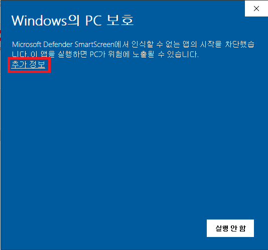처음 실행하면 서명되지 않은 파일(제가 개인적으로 만든 파일)이기 때문에 경고창이 나옵니다. 아래 안내대로 실행해주세요.