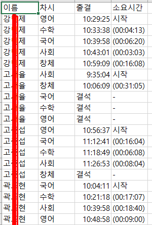 바로학교 이용 학교에서 온라인 수업을 성실히 듣지 않고, 클릭만하고 넘기는 학생들을 파악하여 피드백을 주기 위한 프로그램. 바로학교 컨텐츠 과목별 출결시간을 비교해서 과목당 소요시간이 너무 짧은 학생들을 선별 가능