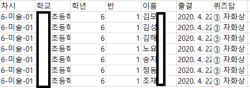 하지만 이 과정에서 퀴즈에 대한 학생의 답변이 사라지기 때문에 근본적인 대책을 위해서는 바로학교 사이트에서 csv파일 생성시에 해당 구조가 망가지지 않게끔 처리해주는 과정이 있다면 데이터를 더 다양하게 활용할 수 있으리라 생각됩니다.