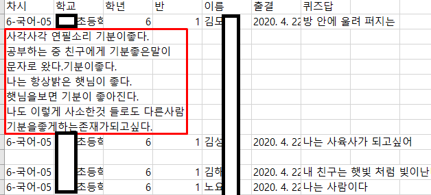 가장 많은 선생님들께서 문제가 되셨던 부분은 바로학교 각 차시 마지막 단계에 있는 '퀴즈'때문이었습니다. 퀴즈에서 답을 적을 때 '엔터키'를 치면 csv파일에서 독립된 row로 인식하면서 데이터 구조가 망가져 버리기 때문이었습니다.