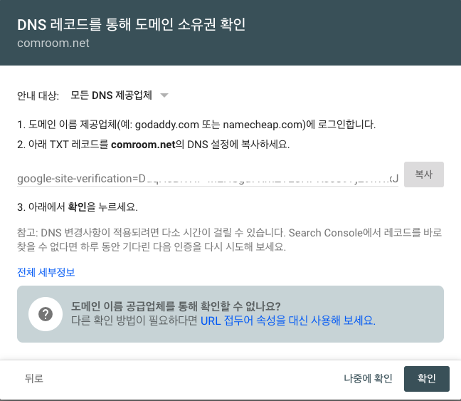 DNS레코드에 TXT가 등록되는데에 시간이 좀 걸린다. 한 시간에서 하루 정도 여유를 갖고, 확인을 눌러주면 정상적으로 소유권 확인이 되었다는 메세지가 뜬다.