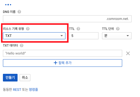 '리소스 기록 유형'을 TXT로 변경하고 TXT데이터에 복사한 텍스트를 붙여넣어준 후 '만들기'를 누른다.