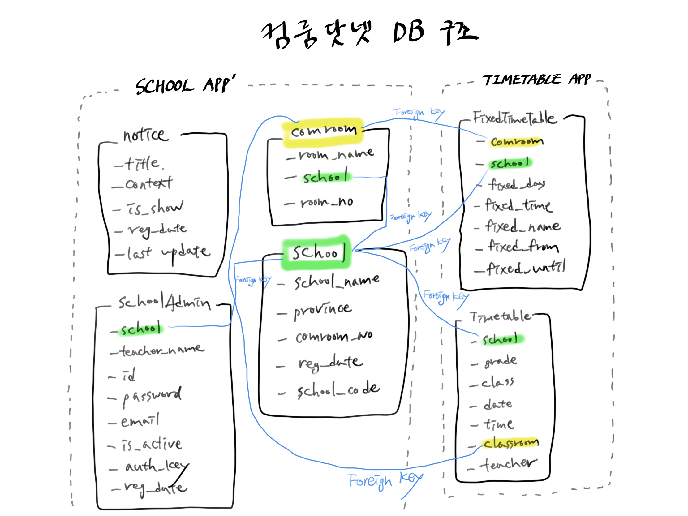timetable과 fixedTimetable 모두 추후 업데이트 될 관리자 통계 페이지를 위해, 학교별, 컴퓨터실 별 검색이 용이하도록 외래 키를 이용해 두 column을 추가했다.
