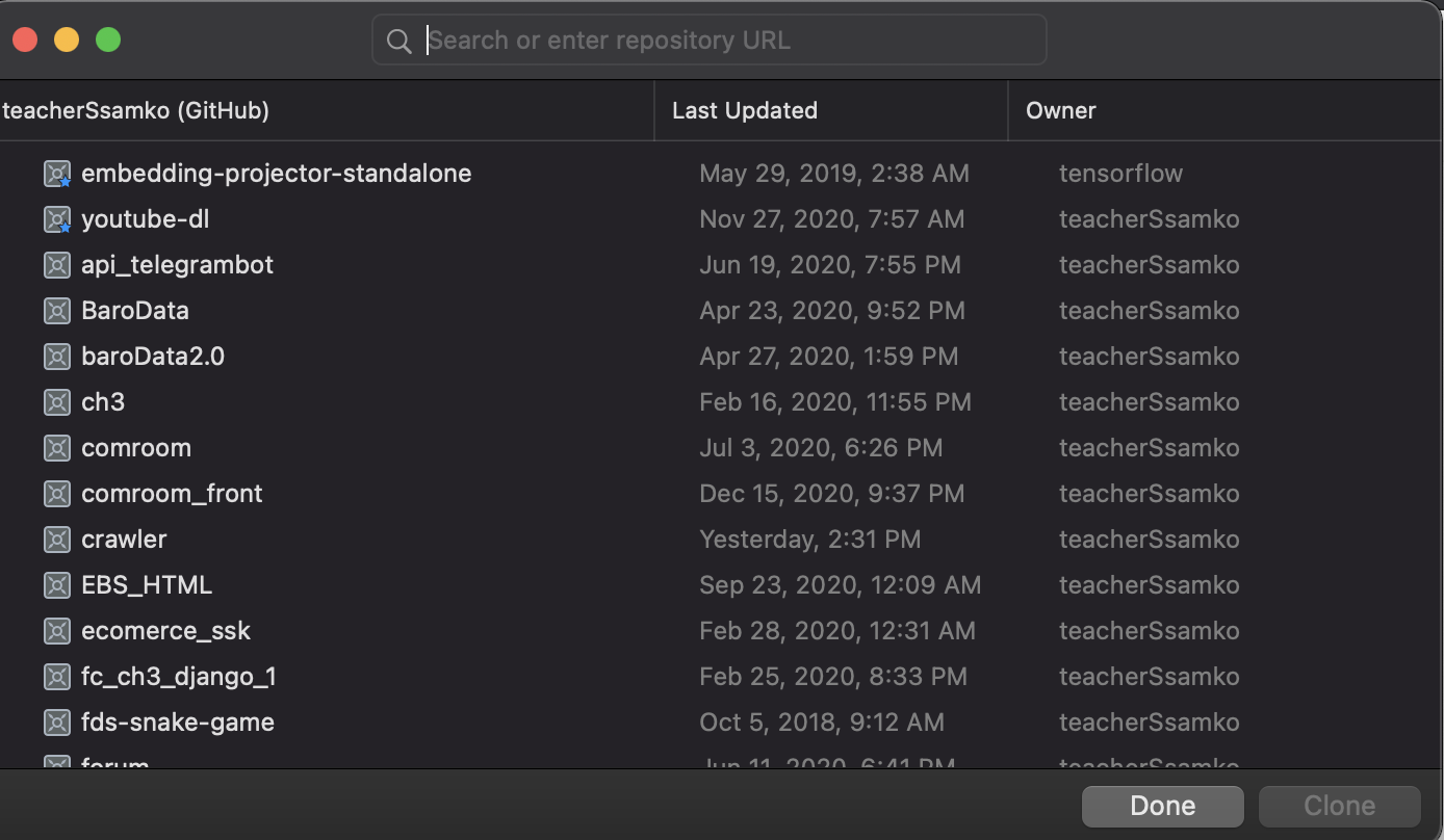 이제 다시 'Clone an existing project'를 선택하면 아래처럼 repository목록이 보입니다.
